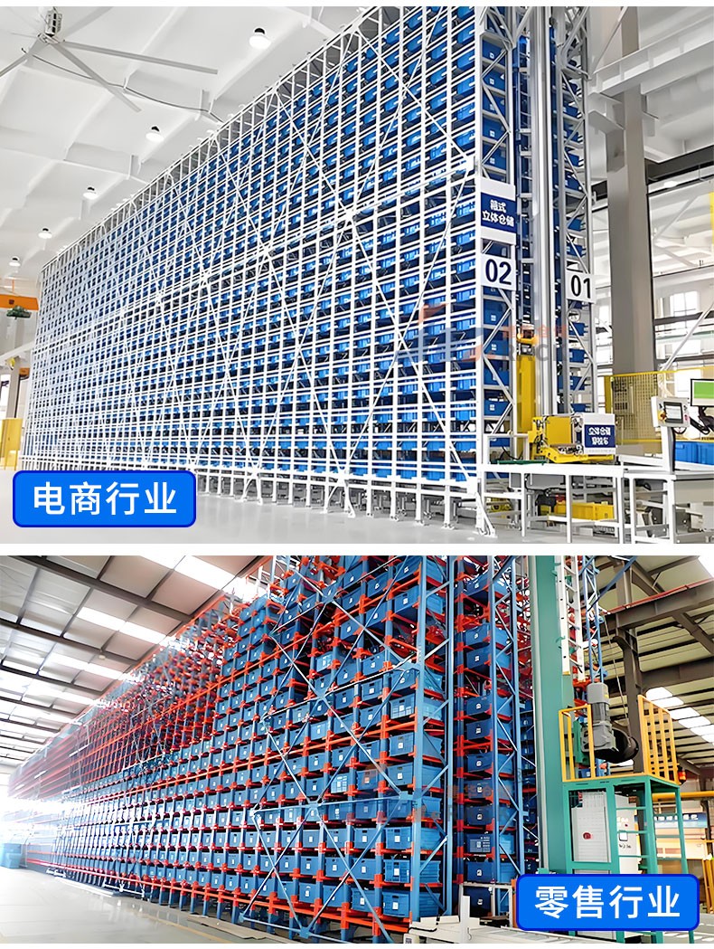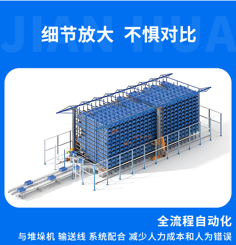 miniload堆垛机料箱立体库是一种自动化高架仓库,主要由箱式架和料箱堆垛机组成。料箱堆垛机在箱式货架之间的巷道上,在水平和垂直方向上移动,在堆垛机载货台上有一个夹具或板叉装置,用于将箱式或框式的小件商品存入或取出单深或双深的货位。miniload立体库的优点是存取速度快,适合小件商品的存储和拣选。